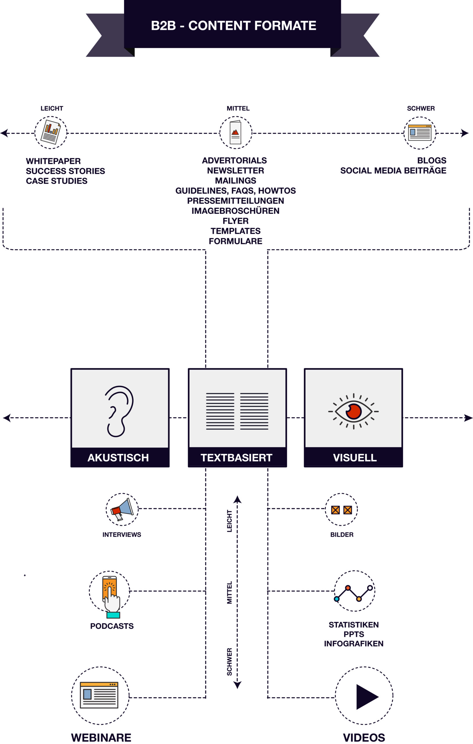 Fein, Sie haben jetzt gelernt, wie Sie erfolgreich Content Marketing betreiben. Aber welchen Content können Sie überhaupt erstellen? Das ist gar nicht so einfach. Unsere Infografik zeigt Ihnen erfolgsversprechende B2B-Content Formate nach dem Grad der Schwierigkeit und den Sinnen, die angesprochen werden. Laden Sie sie sich gerne kostenlos herunter.